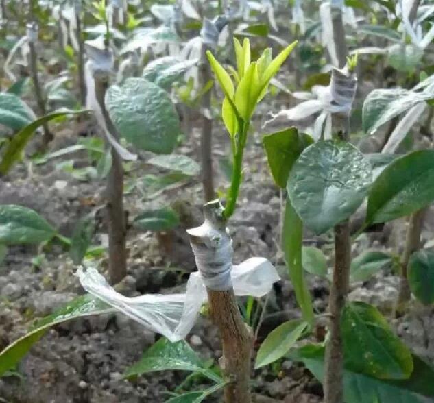 2、把紅檸苗的上部剪去,接上茶枝柑的穗,白色塑料是為砧木與接穗的固定用途,不要小看這工序,這是個技術活來的,一般種植戶做不了這樣的事情。