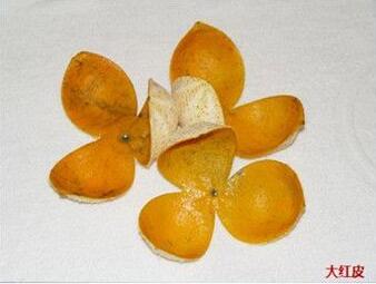 3、大紅皮(紅皮)指果皮已基本著色,生理已基本成熟時(通常指農歷小雪至小寒)采收果實所加工的皮,外表色澤棕紅色至紅黑紅,有無數大而凹入的油室,皺縮十分明顯。內表雪白、淡黃白至棕紅色,海綿浮松狀明顯示。質軟、皮厚,味辛帶甜香。