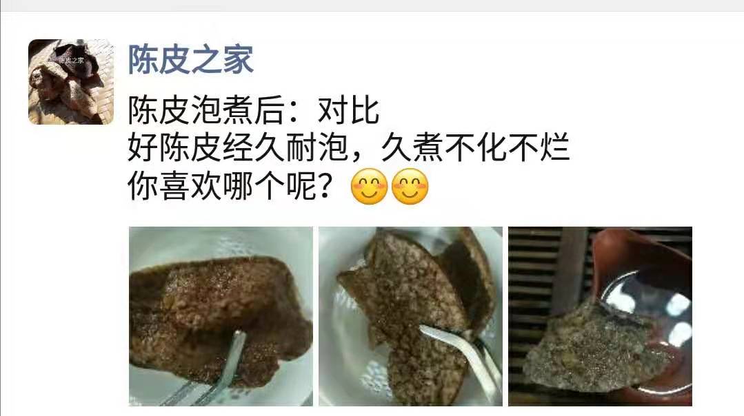 而一煮就爛就化,泡水煮水后湯色混濁的陳皮,最可能第一就不是新會陳皮,例如柑、橘子皮,罐頭廠加工后的桔皮、柑子皮等等外形效仿或不符合新會陳皮特征的陳皮,還有就是例如做舊的濕倉外地皮,經過高溫高濕環境本來果膠含量就不高而又遭到破壞的外形模仿新會陳皮的外地皮,再有就是新會外圍產區便宜的嫩樹又倉儲不好的皮。